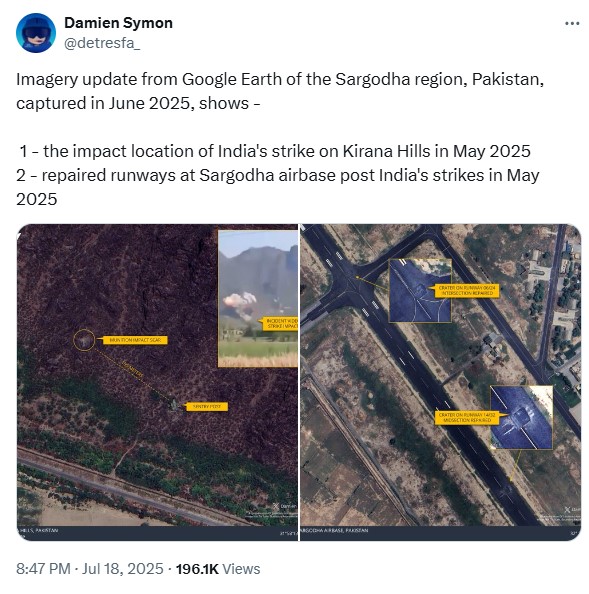 “જૂન 2025ની ગુગલ અર્થ તસવીરો ભારતીય હુમલાની અસરને સ્પષ્ટપણે દર્શાવે છે. કિરાના હિલ્સમાં તબાહી થયા પછીનો બદલો દ્રશ્યમાન છે. સાથે જ સરગોધા એરબેઝનો રનવે પણ નવું બનાવી દેવામાં આવ્યો છે.“