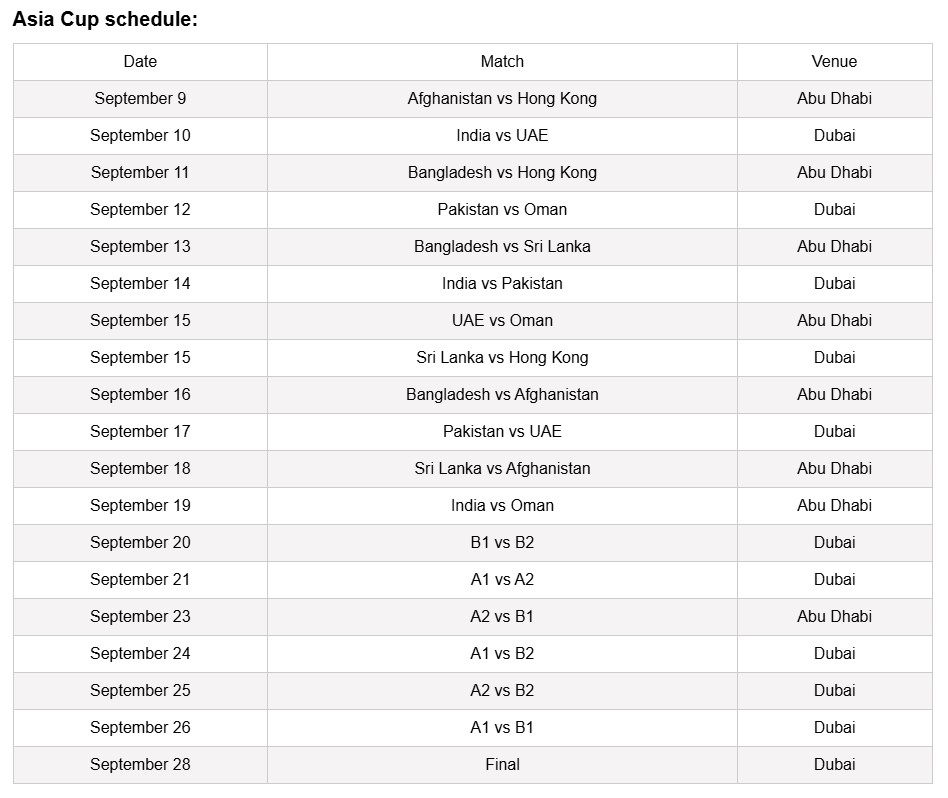 એશિયા કપની પ્રથમ મેચ 9 સપ્ટેમ્બરે અફઘાનિસ્તાન અને હોંગકોંગ વચ્ચે રમાશે. ભારત પોતાની પ્રથમ મેચ 10 સપ્ટેમ્બરે UAE સામે રમશે, બીજી મેચ 14 સપ્ટેમ્બરે પાકિસ્તાન સામે અને ત્રીજી મેચ 19 સપ્ટેમ્બરે ઓમાન સામે રમશે.