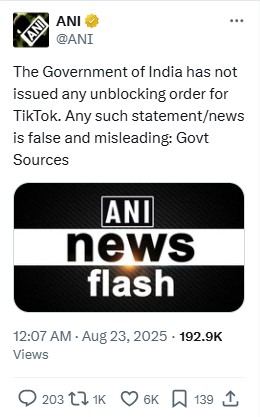 સોશિયલ મીડિયા પર એ દાવો કરવામાં આવી રહ્યો છે કે ચાઈનીઝ વીડિયો શેરિંગ પ્લેટફોર્મ TikTok પર ભારતમાં લગાવવામાં આવેલો પ્રતિબંધ હવે હટાવી લેવામાં આવ્યો છે. જોકે, સરકારે આ દાવાઓને ખોટા અને ભ્રમજનક ગણાવ્યા છે. સરકારી સૂત્રોના જણાવ્યા અનુસાર, ભારત સરકારે TikTokને અનબ્લોક કરવાનો કોઈ સત્તાવાર આદેશ આપ્યો નથી અને આવા દાવાઓમાં કોઇ સત્ય નથી.