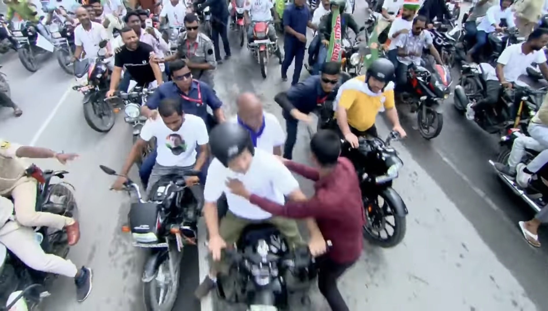 આ ઘટના રવિવારે પૂર્ણિયામાં બની હતી, જ્યાં રાહુલ ગાંધી બુલેટ પર સવાર હતા અને બિહાર કોંગ્રેસ પ્રમુખ રાજેશ રામ તેમની પાછળ બેઠા હતા. રેલી દરમિયાન એક યુવક તેમની બાઇક પાસે પહોંચ્યો અને અચાનક કિસ કરવાની કોશિશ કરી. સુરક્ષા ગાર્ડે તરત જ તેને રોકી લીધો અને થપ્પડ મારીને દૂર હટાવી દીધો.