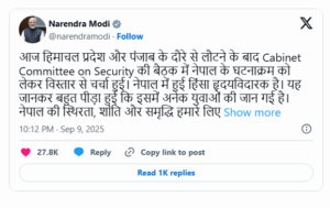 વડાપ્રધાન નરેન્દ્ર મોદીએ નેપાળમાં ચાલી રહેલા યુવાનોના આંદોલન અને હિંસક પ્રદર્શનો અંગે ગંભીર ચિંતા વ્યક્ત કરી છે. હિમાચલ પ્રદેશ અને પંજાબથી પરત ફર્યા બાદ તેમણે કેબિનેટ કમિટી ઓન સિક્યોરિટીની બેઠક બોલાવી અને નેપાળની હાલની પરિસ્થિતિ અંગે ચર્ચા કરી. બાદમાં તેમણે સામાજિક મિડિયા પ્લેટફોર્મ X પર સંદેશ આપ્યો, જેમાં તેમણે લખ્યું કે નેપાળમાં થયેલી હિંસા હૃદયવિદારક છે અને અનેક યુવાનોના મોત થવાથી તેઓ દુઃખી છે.