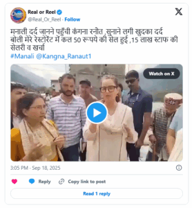 કંગનાએ મહિલાને કહ્યું કે, “તમે મને સવાલ કરો, ચઢાણ ન કરો. જો આક્રમક બનશો તો કામ કેવી રીતે કરી શકીશું?” કંગનાએ પોતાની પણ નુકસાનીની વાત કહી અને ઉમેર્યું કે તેમનું રેસ્ટોરન્ટ પણ બંધ છે અને માત્ર 50 રૂપિયાનું કામ થયું હતું.
