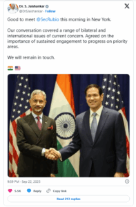 ન્યૂયોર્ક: સંયુક્ત રાષ્ટ્ર મહાસભાના 80મા સત્ર દરમિયાન ભારતીય વિદેશ મંત્રી એસ. જયશંકરે યુએસ સેક્રેટરી ઓફ સ્ટેટ માર્કો રુબિયો સાથે દ્વિપક્ષીય બેઠક કરી.